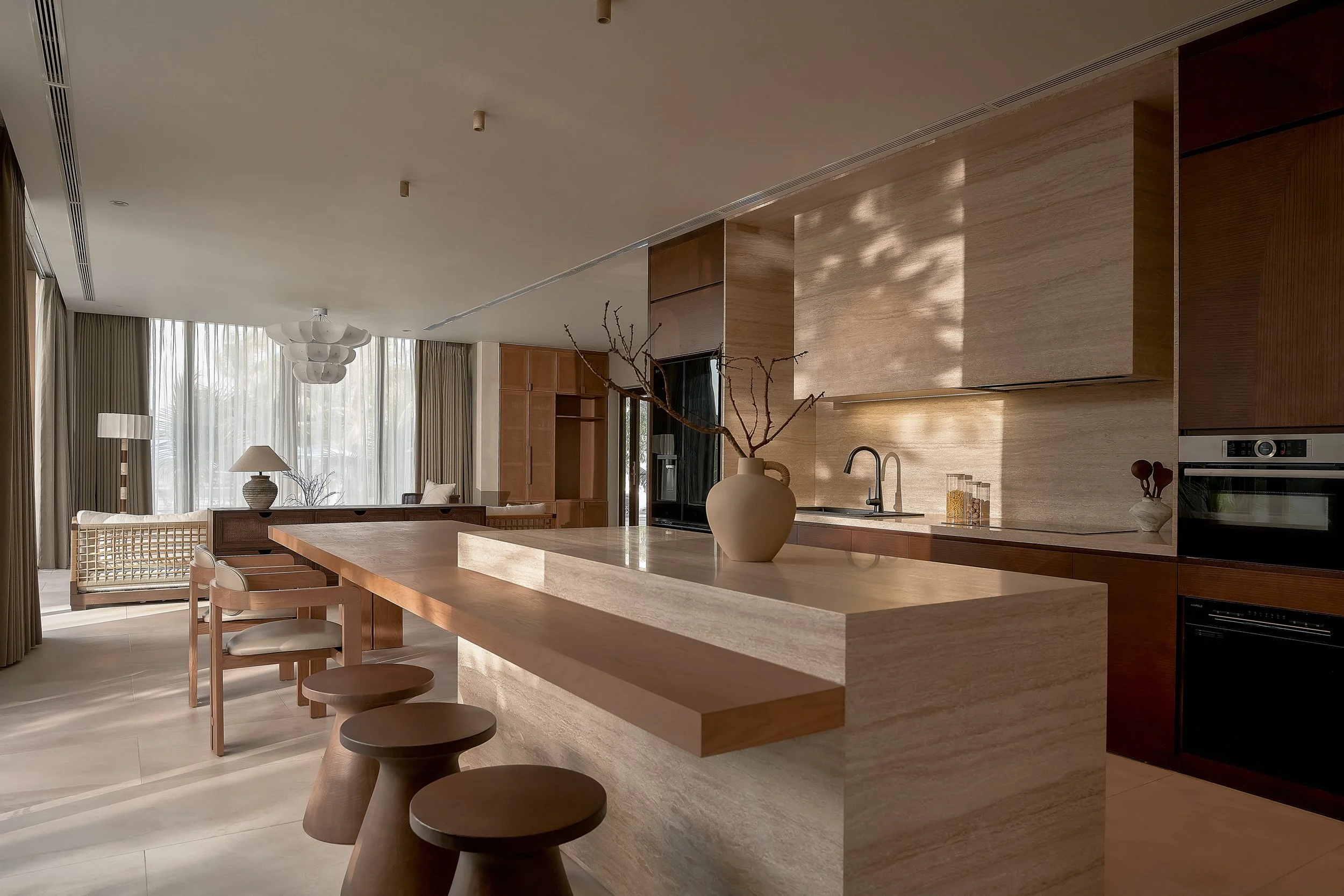 Mỗi không gian nội thất được thể hiện với sự tinh tế và sang trọng, nơi ánh sáng, vật liệu và bố cục được sắp đặt hài hòa, tạo nên một tổng thể cuốn hút và liền mạch.