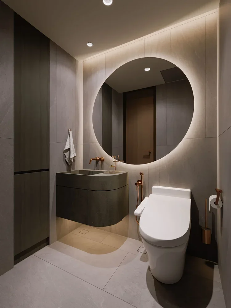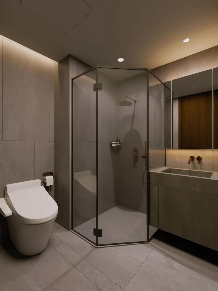 Khu vực phòng tắm được tạo nên tự sự đề cao tiện nghi và phong cách thanh lịch tối giản. Chất liệu sàn đá chống thấm và chống trơn trượt được lựa chọn để đảm bảo công năng sử dụng, trong khi hệ vách kính kết hợp cùng nội thất kim loại ánh đồng góp phần tôn lên vẻ cao cấp cho không gian.
