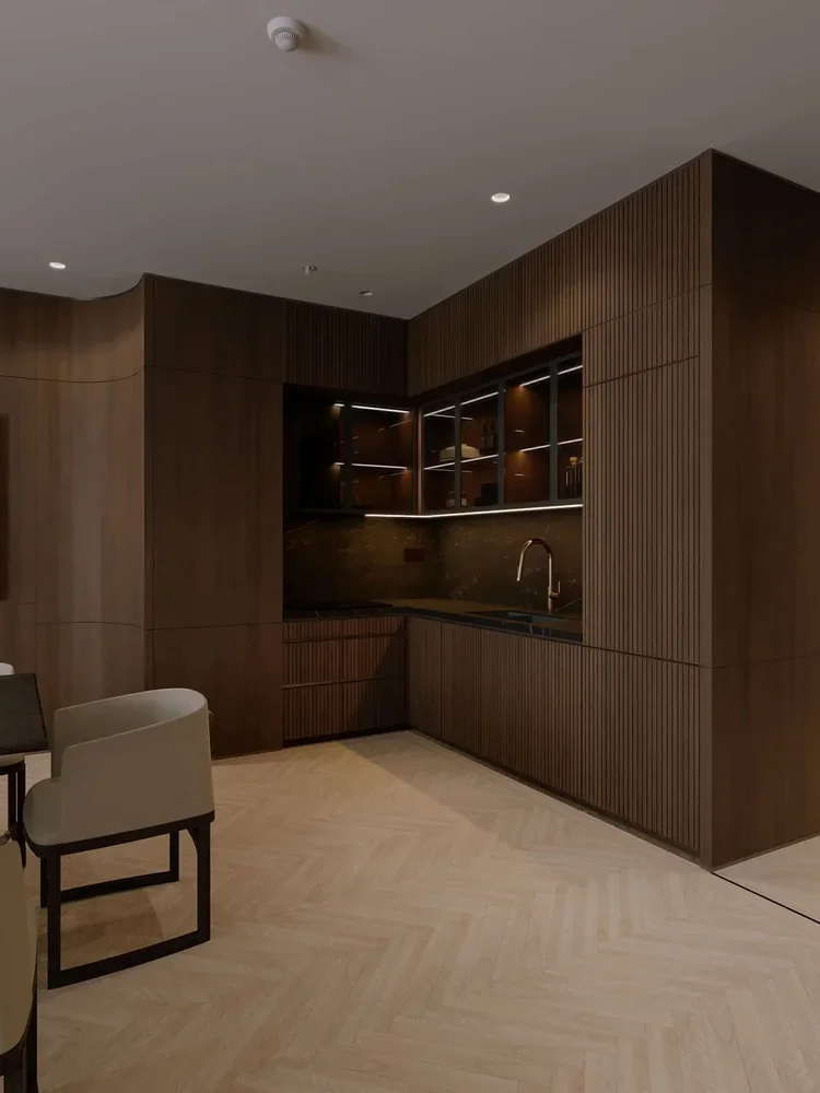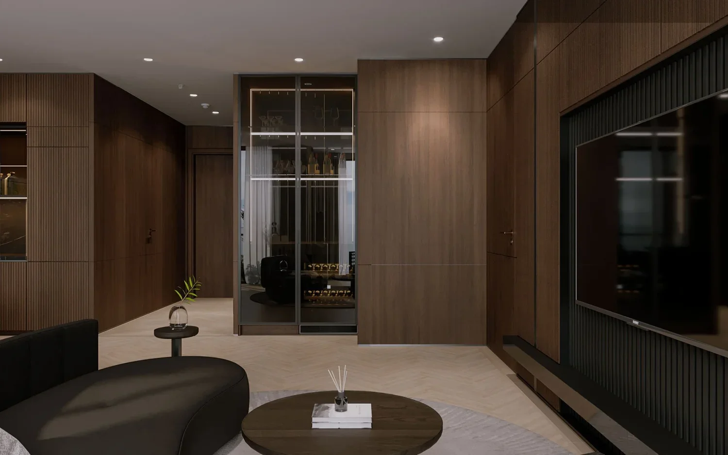 Không gian mở ra như một bản hòa âm của ánh sáng và trật tự. Gỗ trầm ấm ôm lấy những mảng tường phẳng mịn, đường nét tối giản nhưng dứt khoát, để từng chi tiết được đặt đúng vị trí của nó.